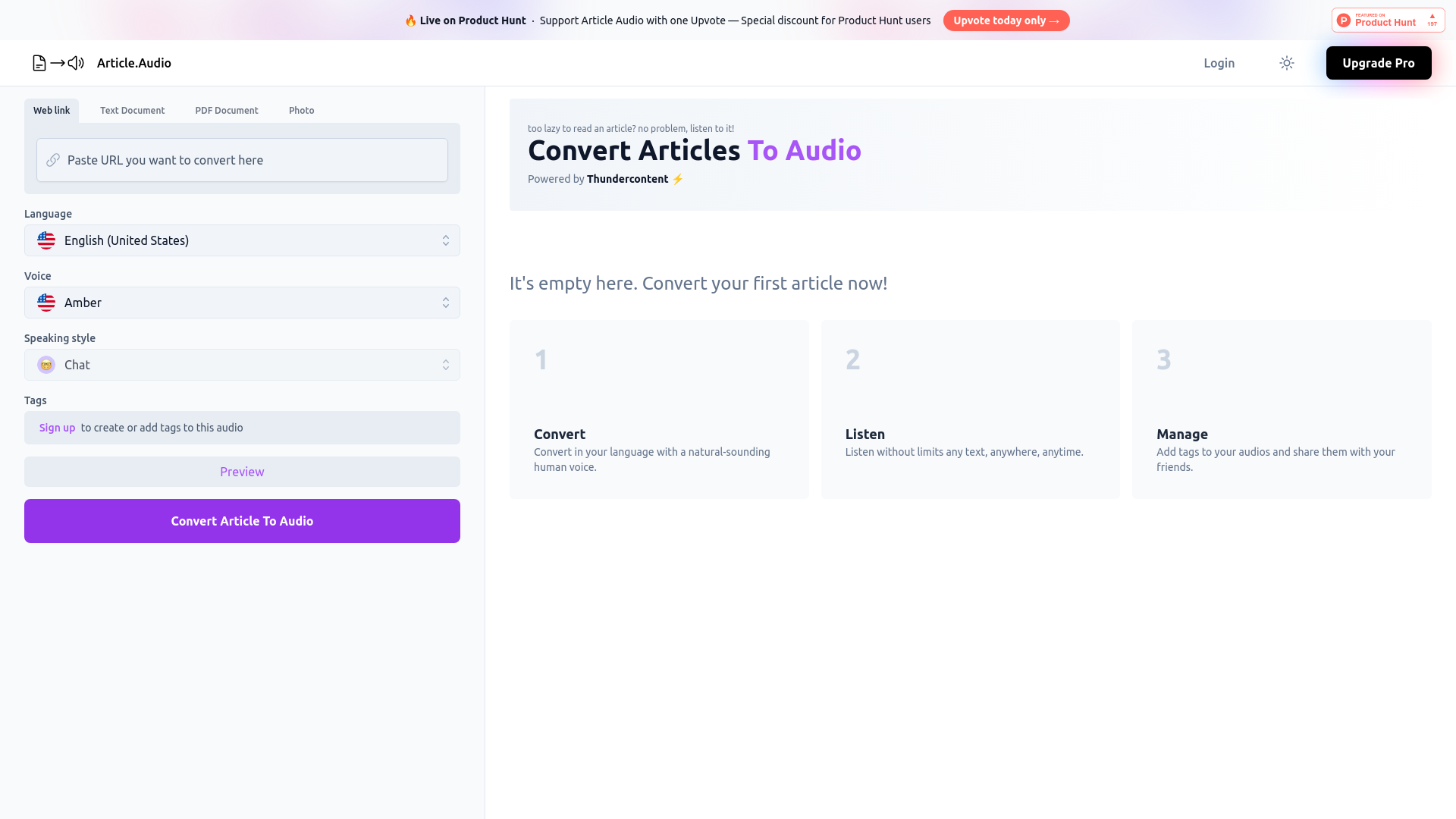 Article.Audio Pro offers a comprehensive solution for converting articles to audio, leveraging Thundercontent's technology. It supports diverse formats like web links, text, PDF, and photo uploads, an