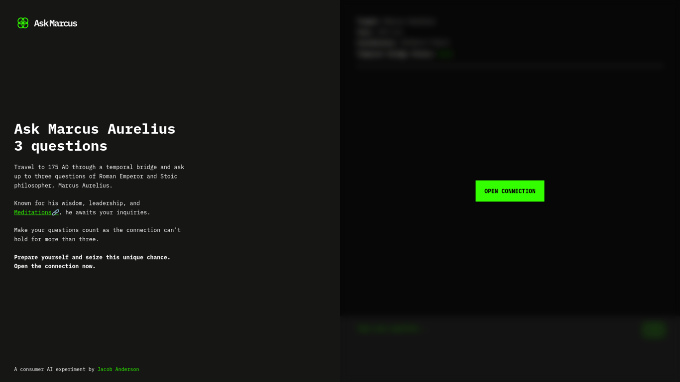 AskMarcus.ai is a groundbreaking digital platform that allows users to engage directly with Marcus Aurelius, the revered Stoic philosopher and Roman Emperor, via a temporal connection established to t