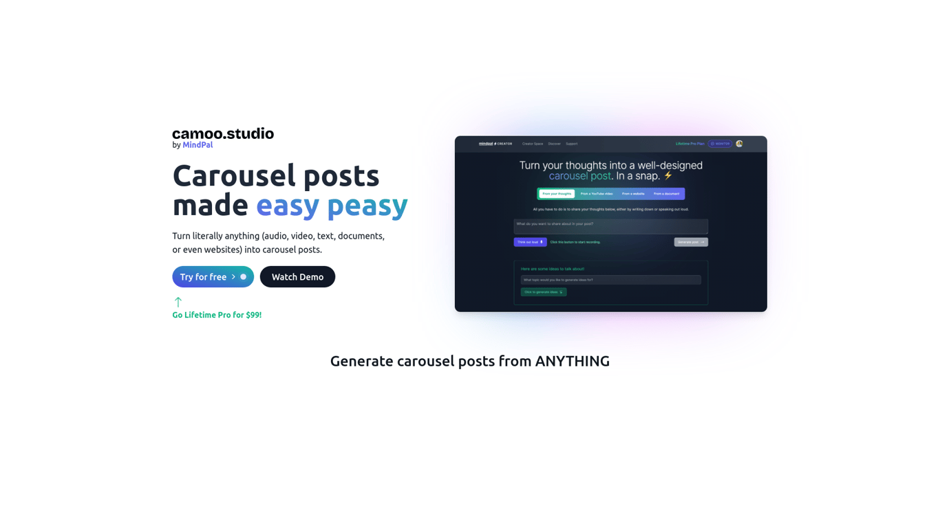 MindPal simplifies the creation of carousel posts, allowing users to turn audio, video, text, documents, or even websites into engaging content. With MindPal, you can boost your content production by