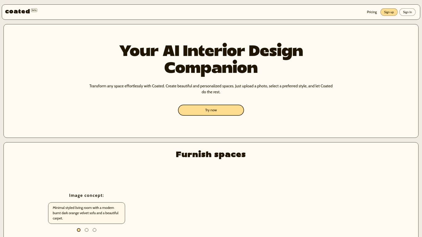 Coated is your AI interior design companion that helps you effortlessly transform any space to look beautiful and personalized. Just upload a photo of your room, select a preferred style from 11+ pred