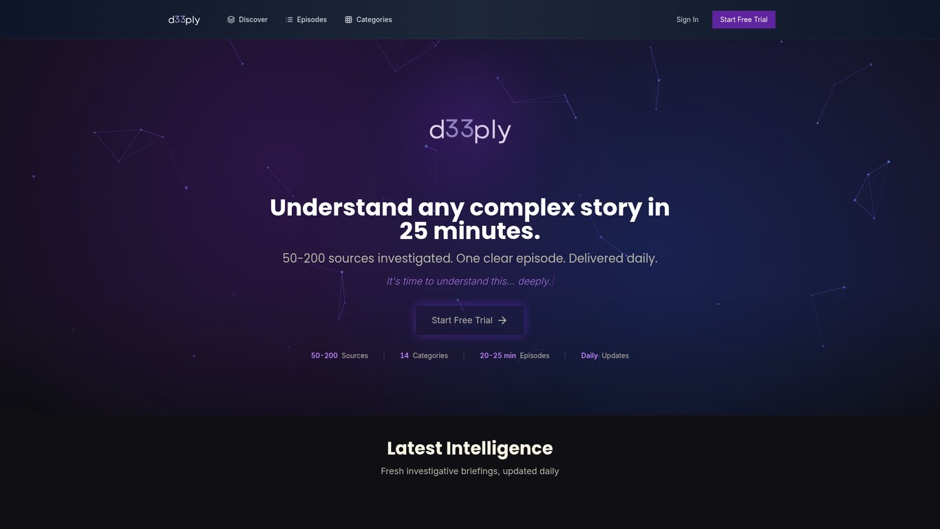 d33ply is an AI-powered investigative journalism podcast platform delivering 25‑minute daily deep dives across 14 categories, built on a 4‑layer RAG research pipeline that synthesizes 50–200 verified