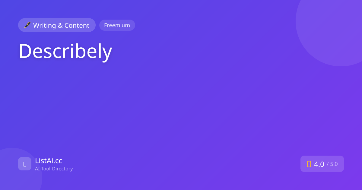 DescribelyAI product description writer for online stores Pricing: Freemium. See pros, cons, alternatives, and comparisons.FreemiumWritingDeveloper ToolsVisit Describely