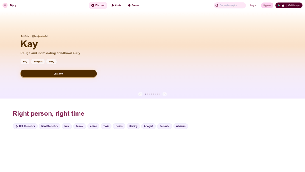 Dippy.ai is an integrated platform featuring navigation through various sections such as Discover, Chats, and Create. Users can explore diverse content, communicate through messages, and generate thei