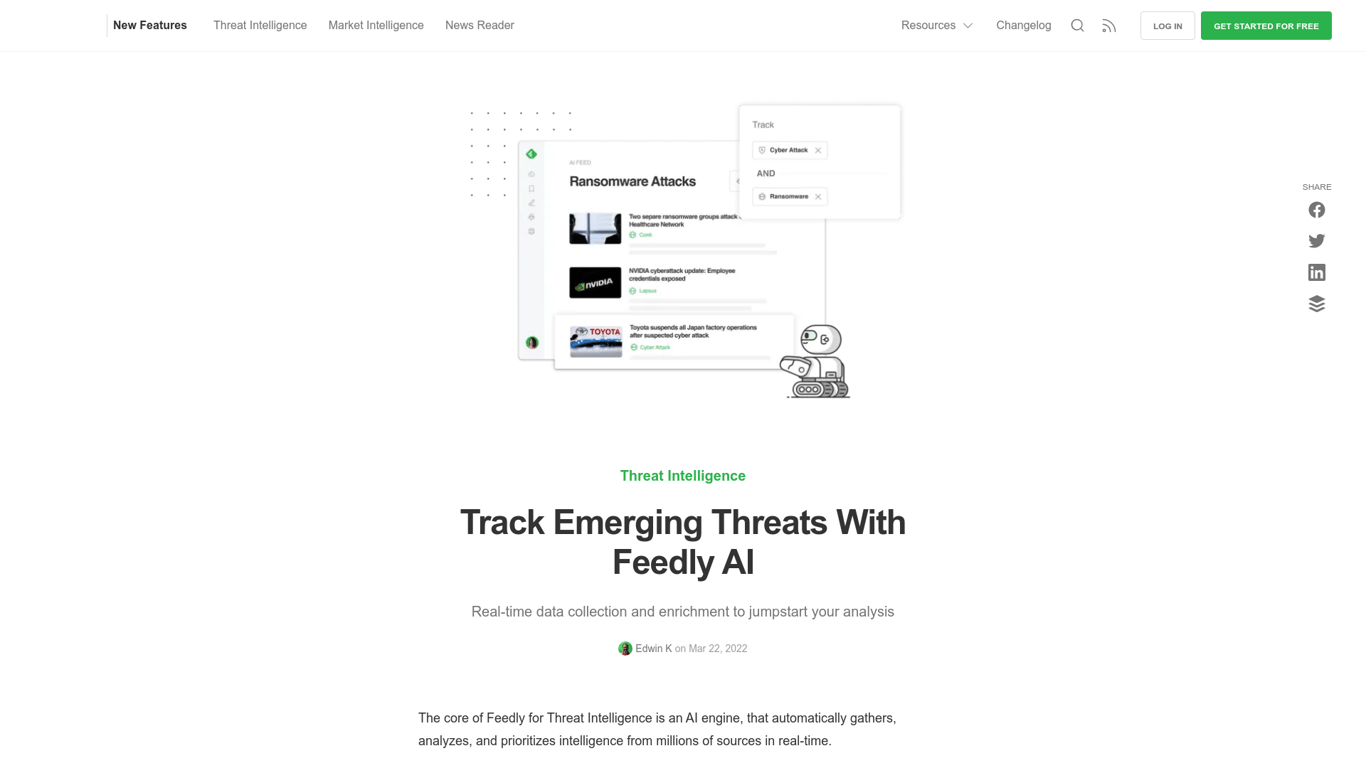 Feedly AI for Threat Intelligence leverages an advanced AI engine to gather, analyze, and prioritize intelligence from millions of diverse sources in real-time. This integration allows users to monito