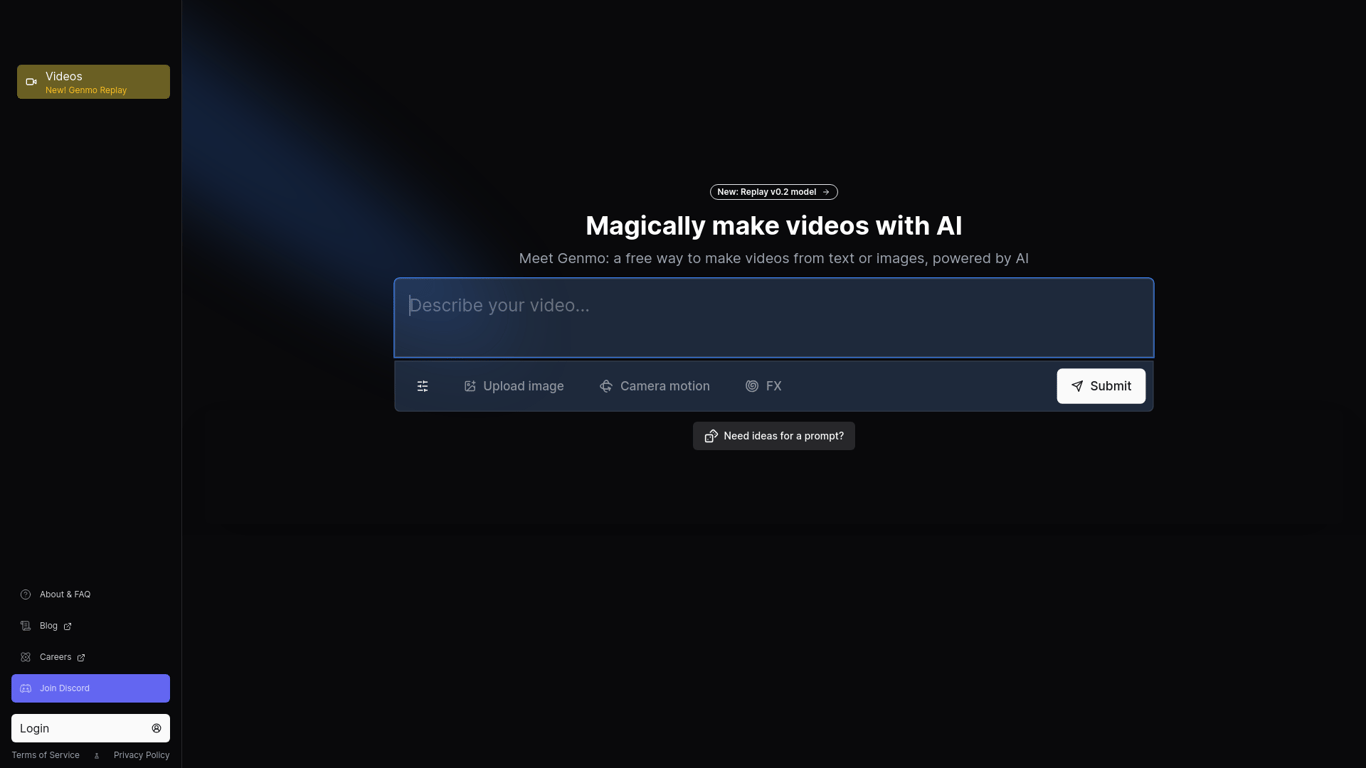 Genmo is an innovative platform that harnesses the power of AI to empower users to create videos from text or images for free. With features like the new Genmo Replay v0.2, camera motion, FX, and imag