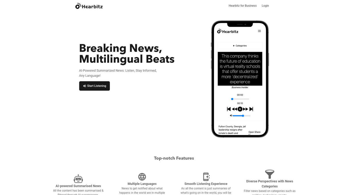 Hearbitz is an innovative platform delivering AI-powered, multilingual news summaries through captivating voice experiences. The platform offers tailored news updates across multiple categories includ