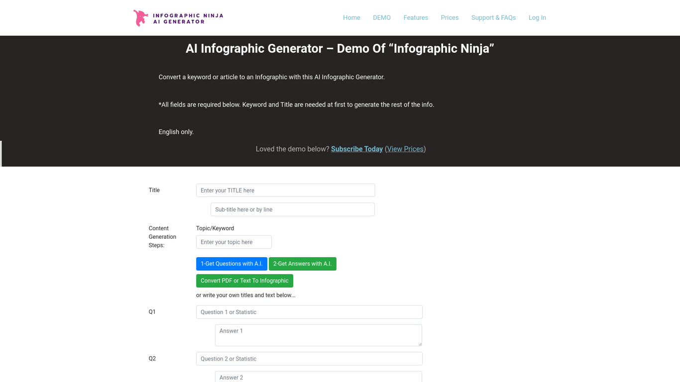 Infographic Ninja is an AI-powered tool designed to transform a keyword or article into a visually appealing infographic. The tool offers a variety of templates and customization options, including ic