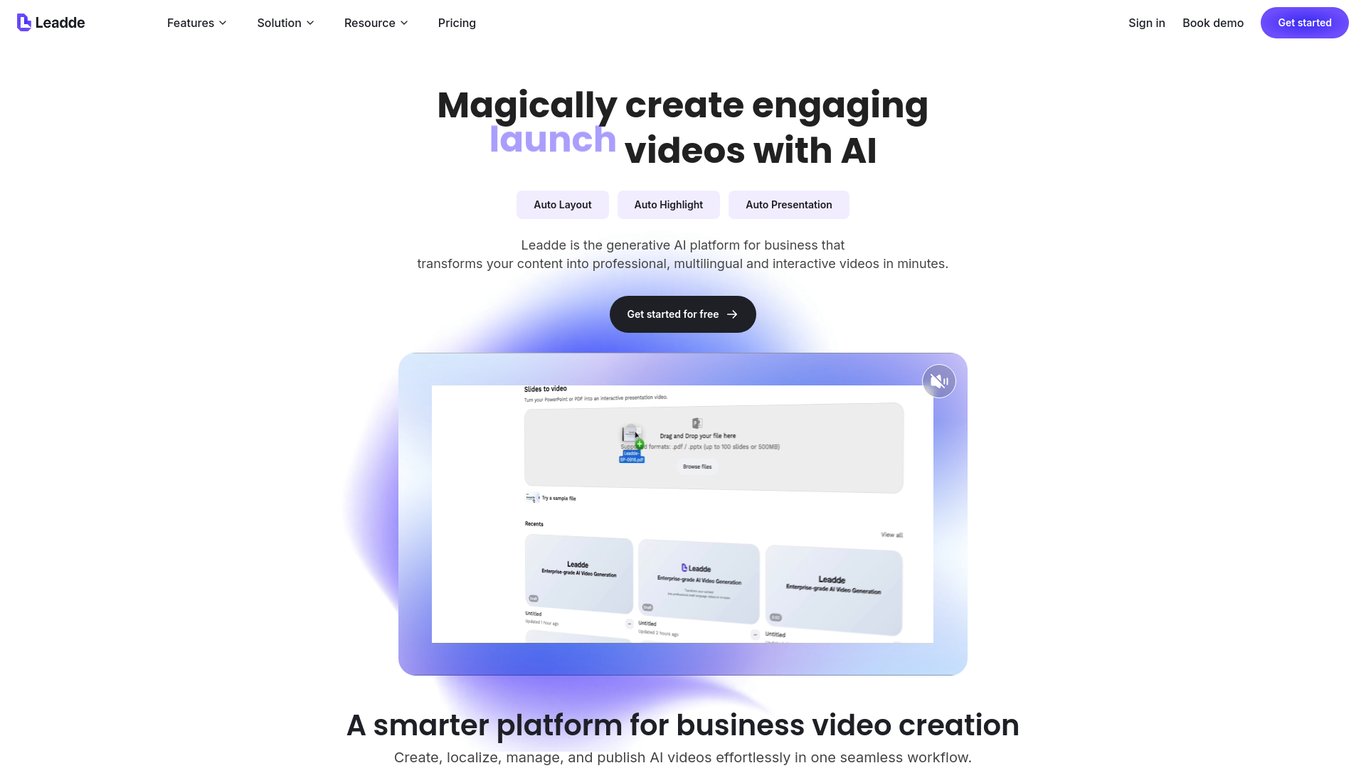 Leadde is a generative AI video creation platform that turns your business documents, PDFs, PPT decks, and text into professional, multilingual videos—complete with lifelike AI avatars, auto‑generated