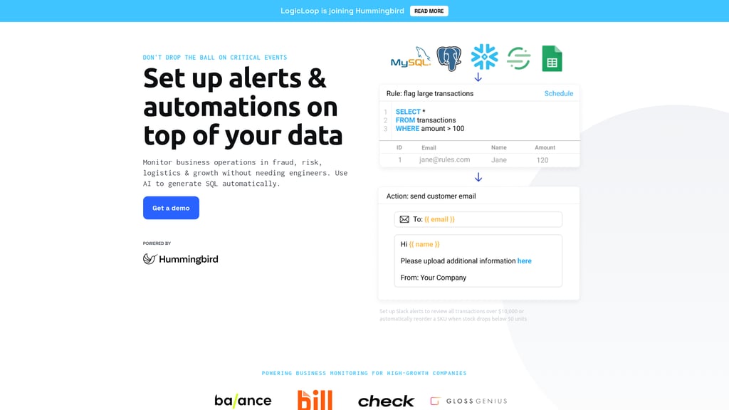 LogicLoop, now incorporated into Hummingbird, is a no-code platform that empowers operational teams to build alerts and automations without the need for engineering support. This platform is designed