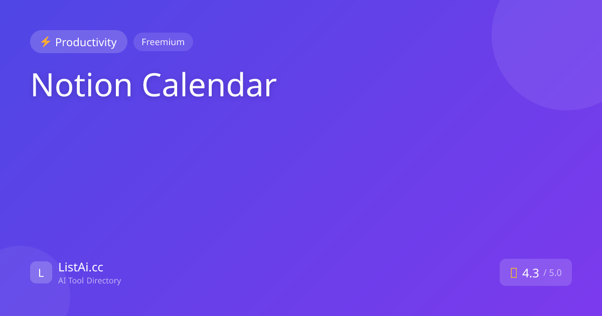 Notion CalendarAI-connected calendar integrated with Notion Pricing: Freemium. See pros, cons, alternatives, and comparisons.Open SourceWritingDeveloper ToolsVisit Notion Calendar