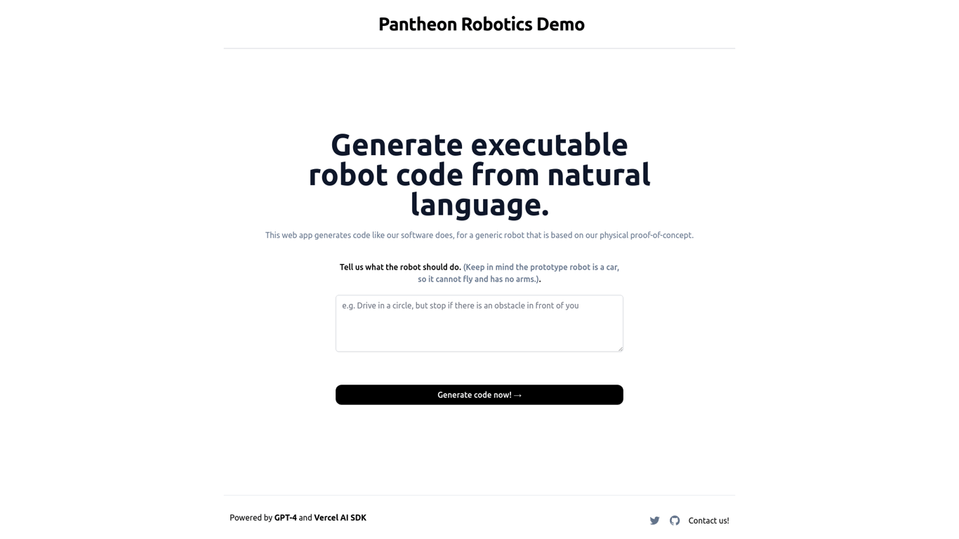 Pantheon Robotics Demo is an innovative web app that generates executable robot code based on natural language instructions. Specifically designed for a prototype car-like robot that lacks arms and ca