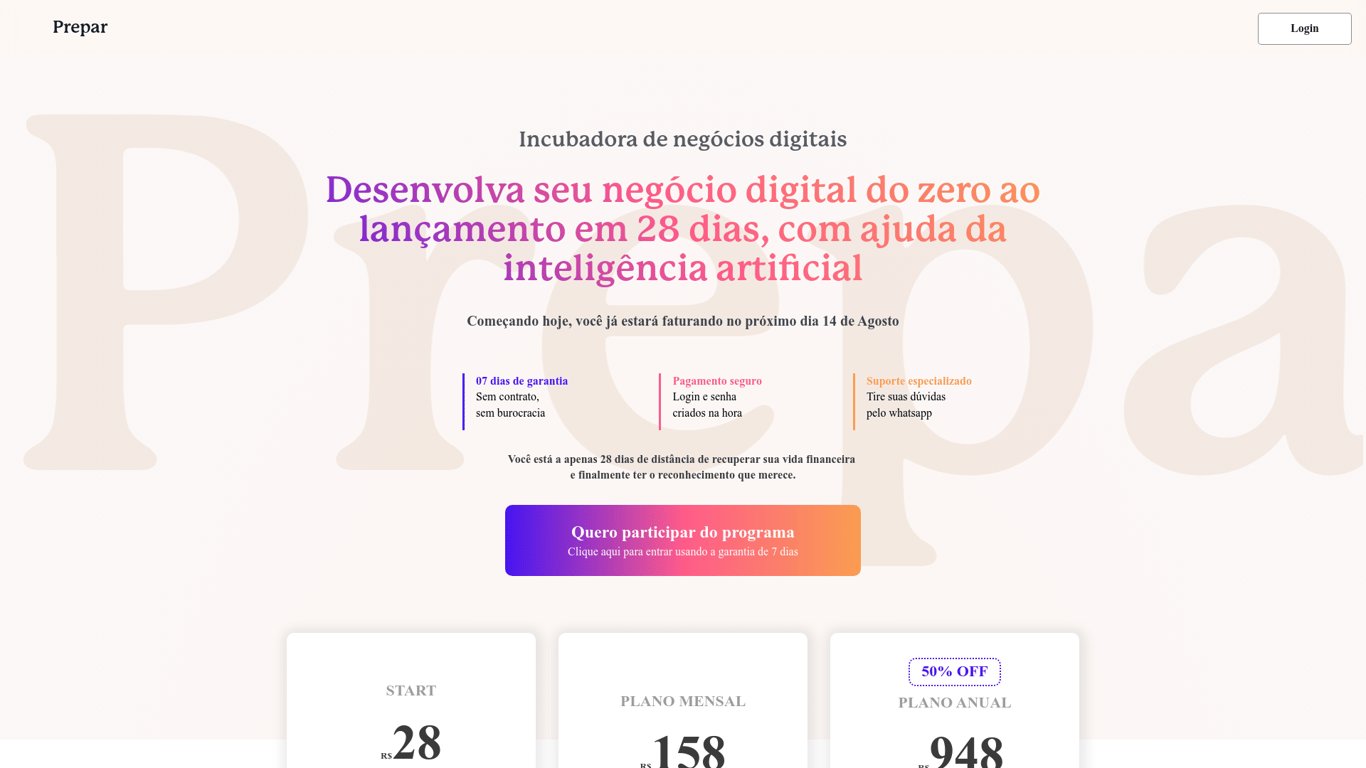 Prepar is a digital business incubator program designed to help you develop your digital business from scratch to launch in just 28 days, with the assistance of artificial intelligence. It offers a st