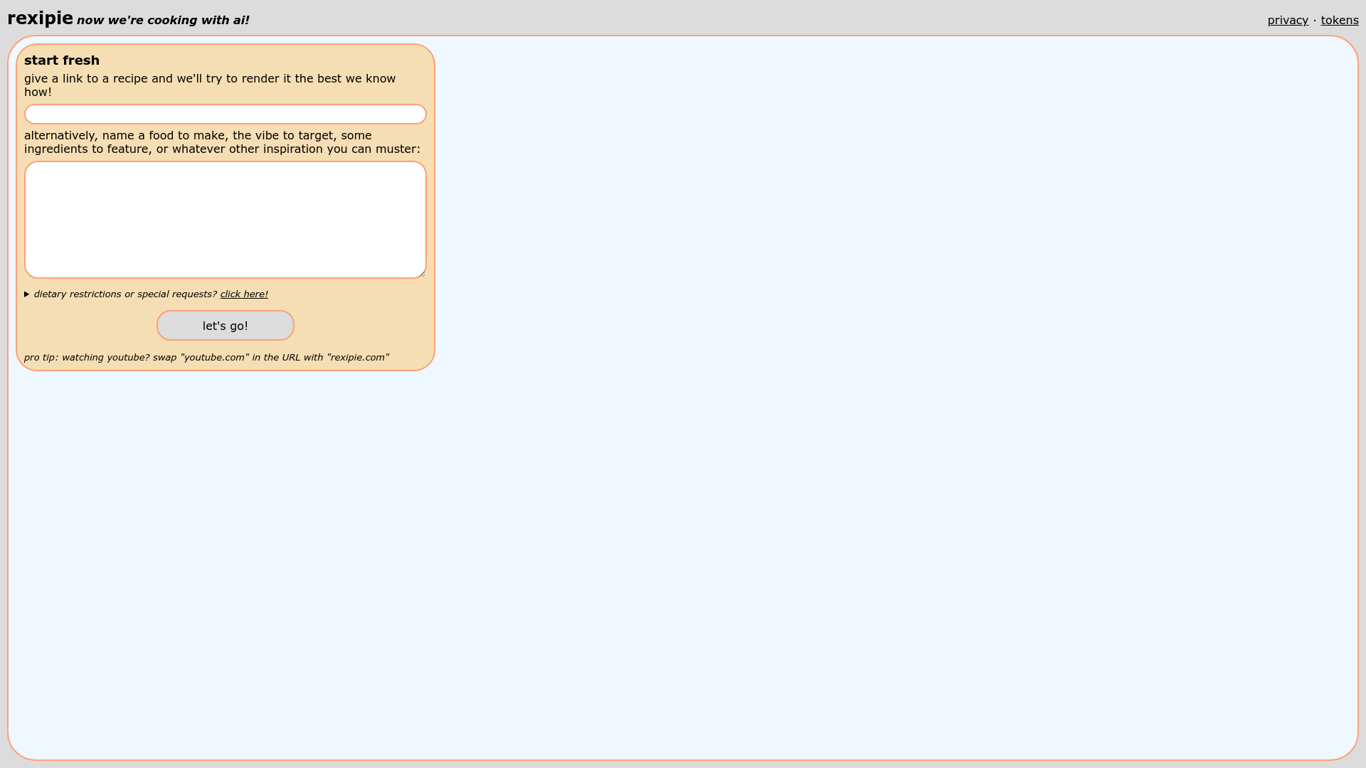 Rexipie is a cooking platform that leverages AI to render recipes. Users can generate recipes by providing a link or naming a food, describing a vibe, or suggesting ingredients. They can opt for basic