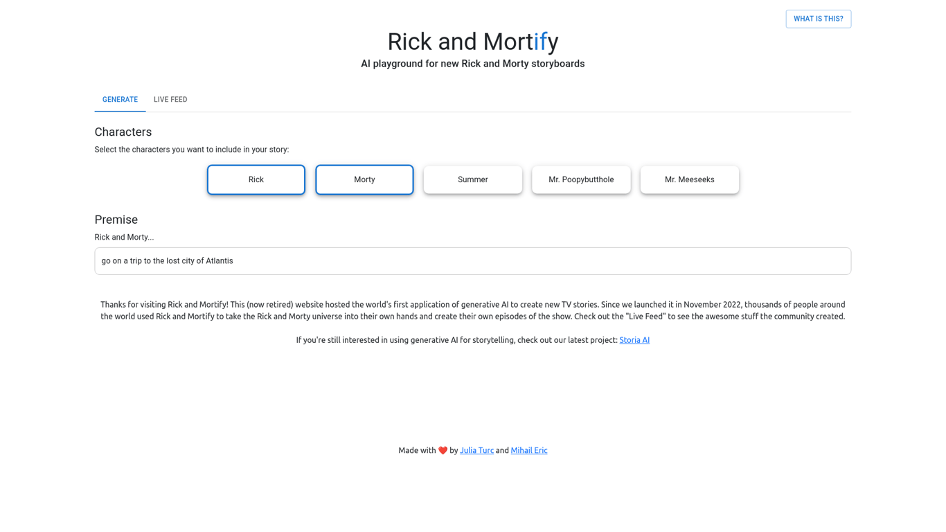 Rick and Mortify was an innovative AI playground that allowed users to generate new storyboards for the TV show 'Rick and Morty' using advanced generative AI technology. Launched in November 2022, it