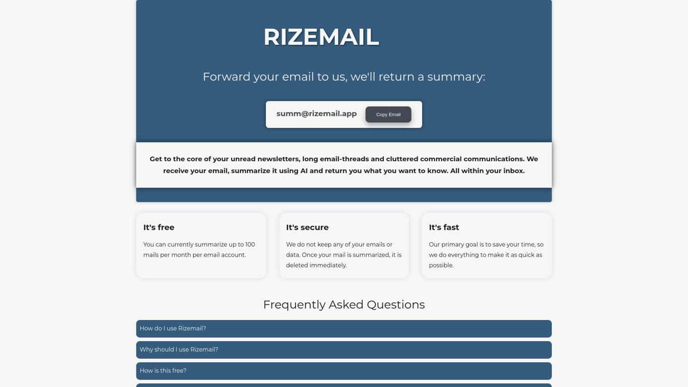 Rizemail provides an AI-based email summarization service that helps users quickly distill the content of their emails without leaving their inbox. Users can forward emails to summ@rizemail.app and re