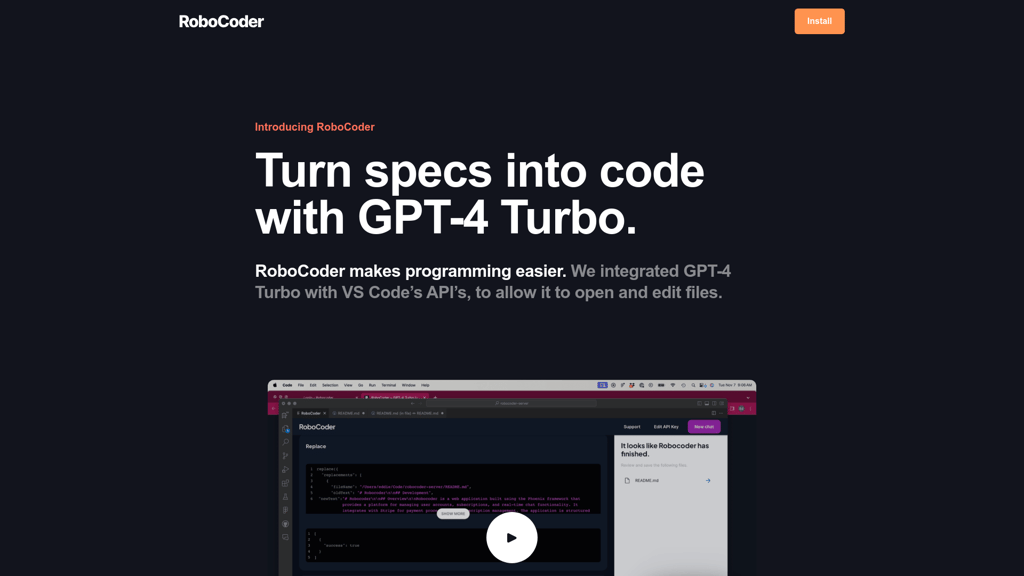 RoboCoder is an innovative tool that simplifies programming by turning written specifications into code. Utilizing the advanced capabilities of GPT-4 Turbo, this tool integrates seamlessly with VS Cod