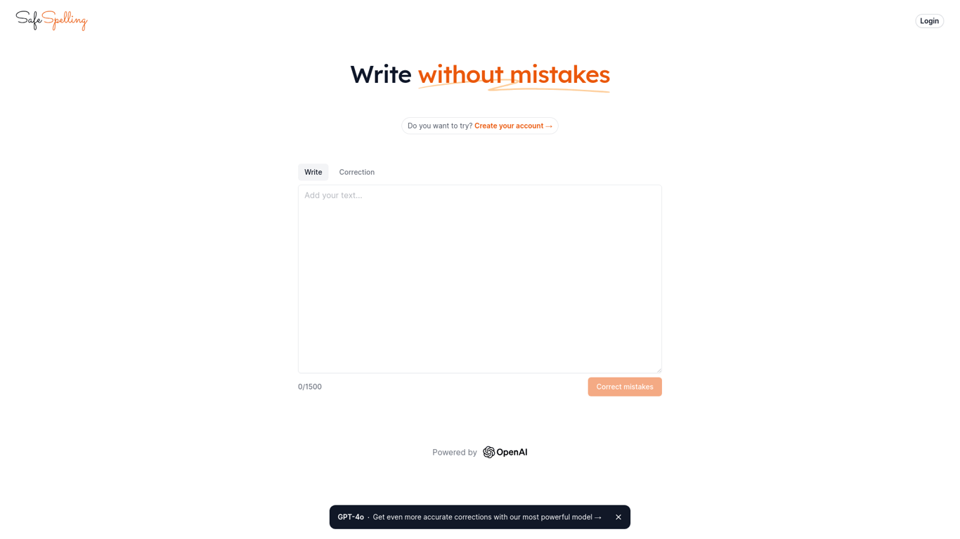SafeSpelling is an advanced spelling and grammar correction tool powered by GPT-4. It helps users to write without mistakes, ensuring highly accurate corrections. By creating an account, users can har