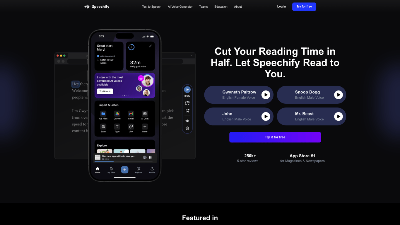 The AI Voice Generator from Speechify offers a suite of cutting-edge tools for audio and video content creation. This includes AI Voice Over for converting text into high-quality audio files, Voice Cl