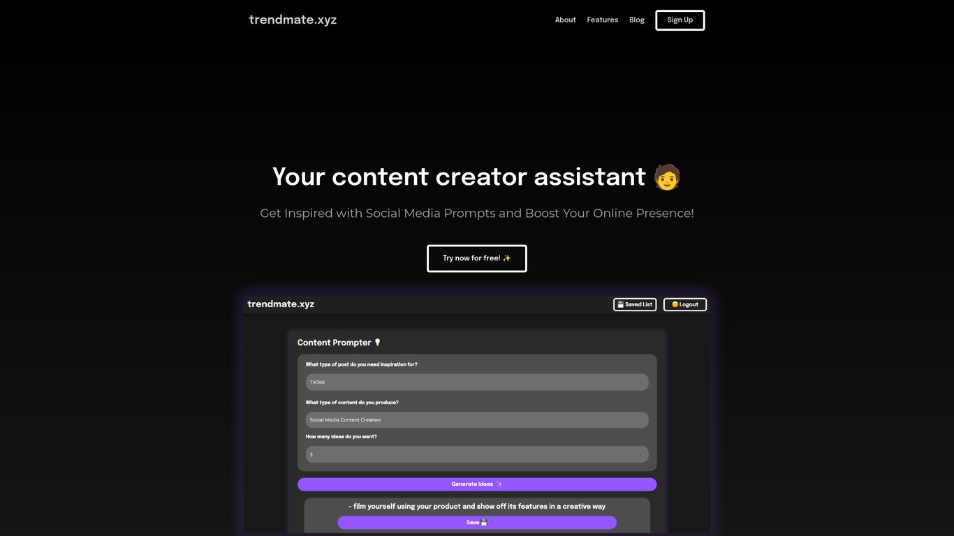 Trendmate.xyz is an AI-powered content idea generation tool that helps content creators, influencers, and marketers overcome creative blocks and enhance their online presence. It provides quick, custo