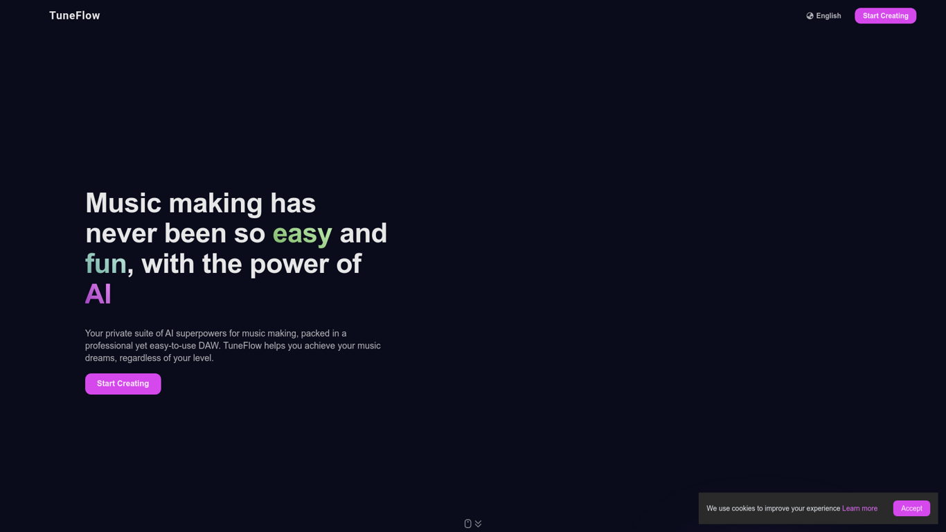 TuneFlow is an all-in-one music and audio studio that comes equipped with over 10 industry-leading AI features. This powerful platform facilitates Audio Source Separation, Audio-to-MIDI Transcription,