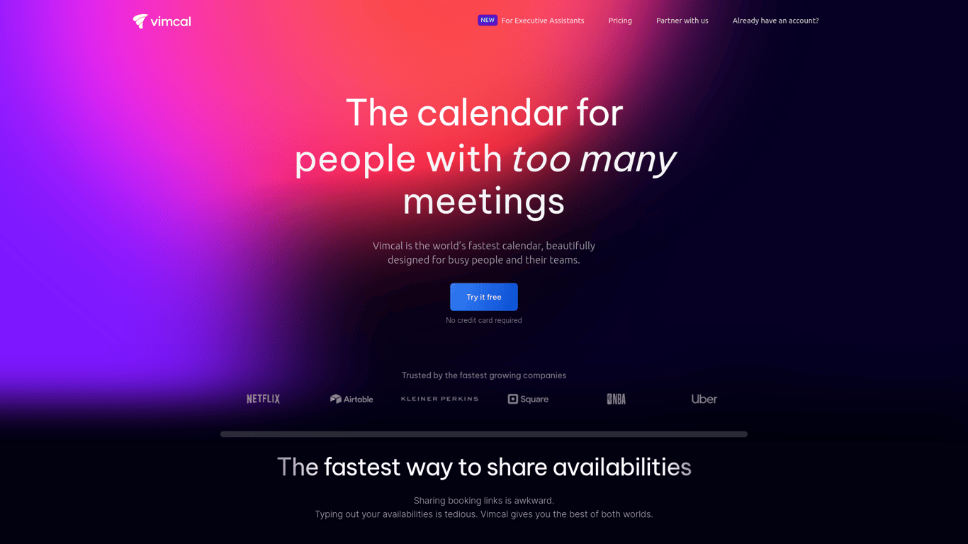 Vimcal is touted as the world's fastest calendar, specifically designed for busy individuals and teams. Not only does it promise lightning-fast performance with instant responses and comprehensive sho