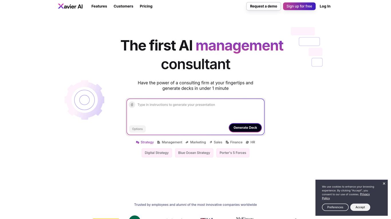 Xavier is the world’s first AI strategy consultant, built to replace expensive agency work with instant, boardroom-ready strategy output. Whether you're crafting an investor pitch, market entry plan,